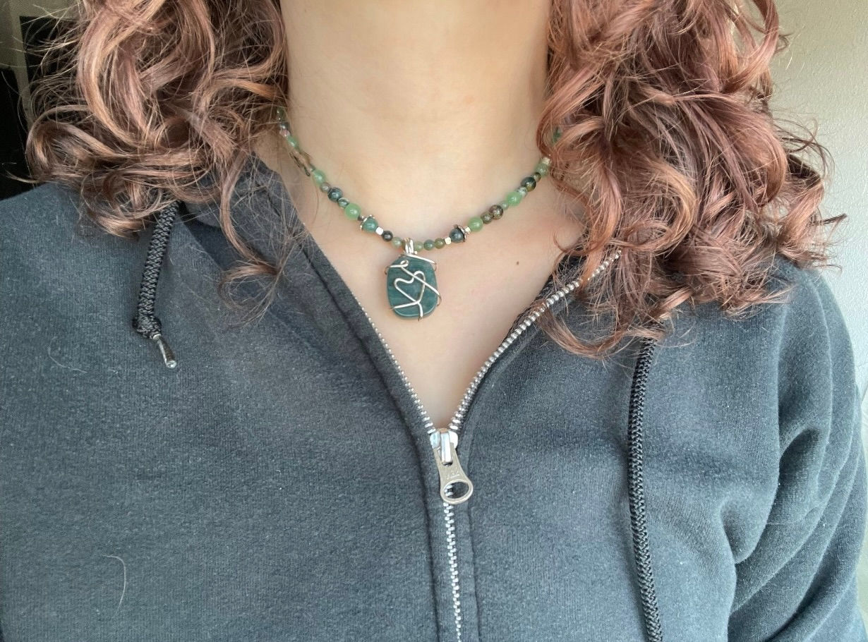 This beautiful, unique, and handmade necklace is made with moss agate, aventurine, ocean jasper, jade.