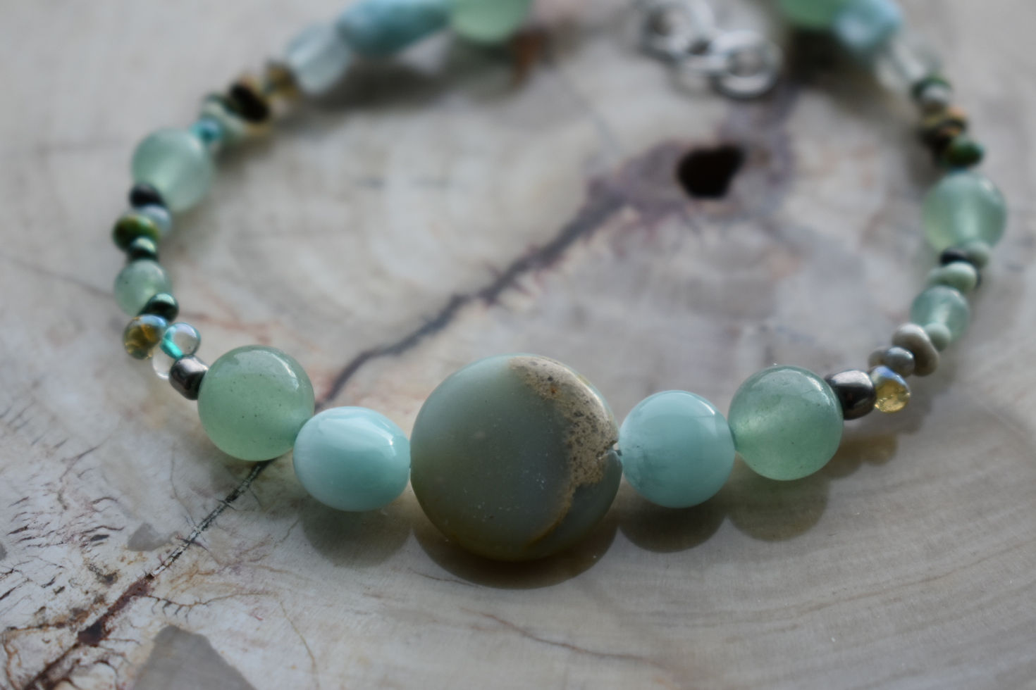 The Moon bracelet is made out of seed beads, aventurine beads, aquamarine beads, larimar beads, and green moonstone beads.