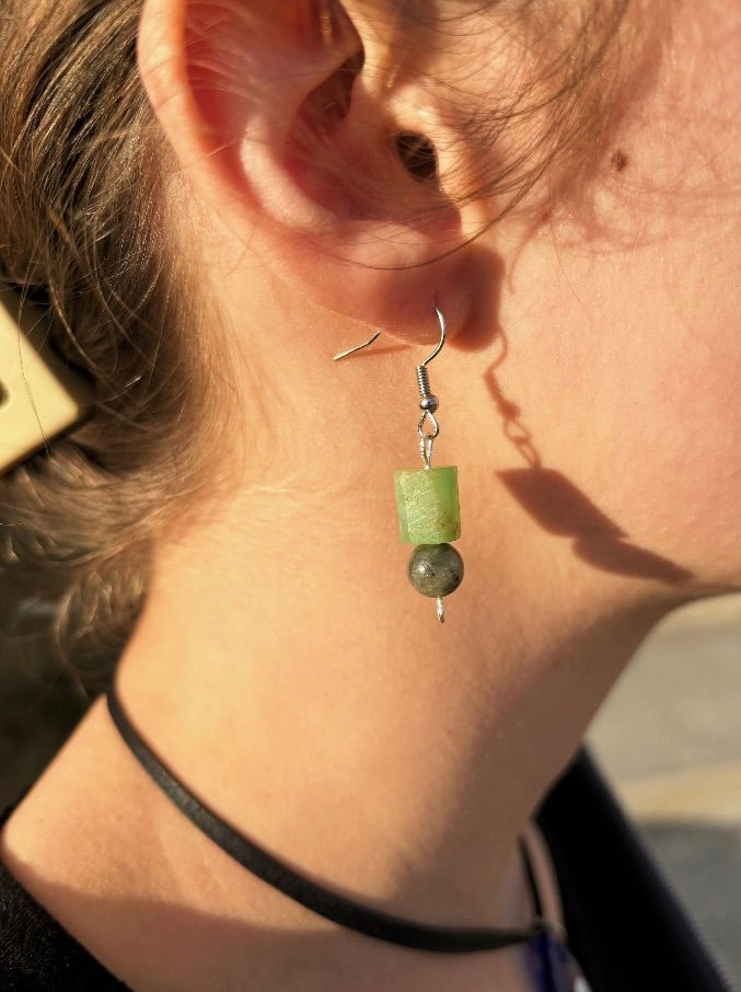 These beautiful, unique, and handmade earrings are made with jade and chrysoprase beads.