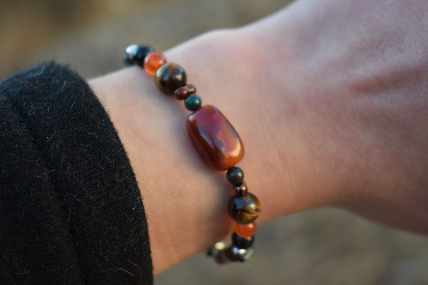 The Shyanne bracelet is one-of-a-kind and handmade. Shyanne is made with carnelian, obsidian, tigers eye, bloodstone, and Smokey quartz.