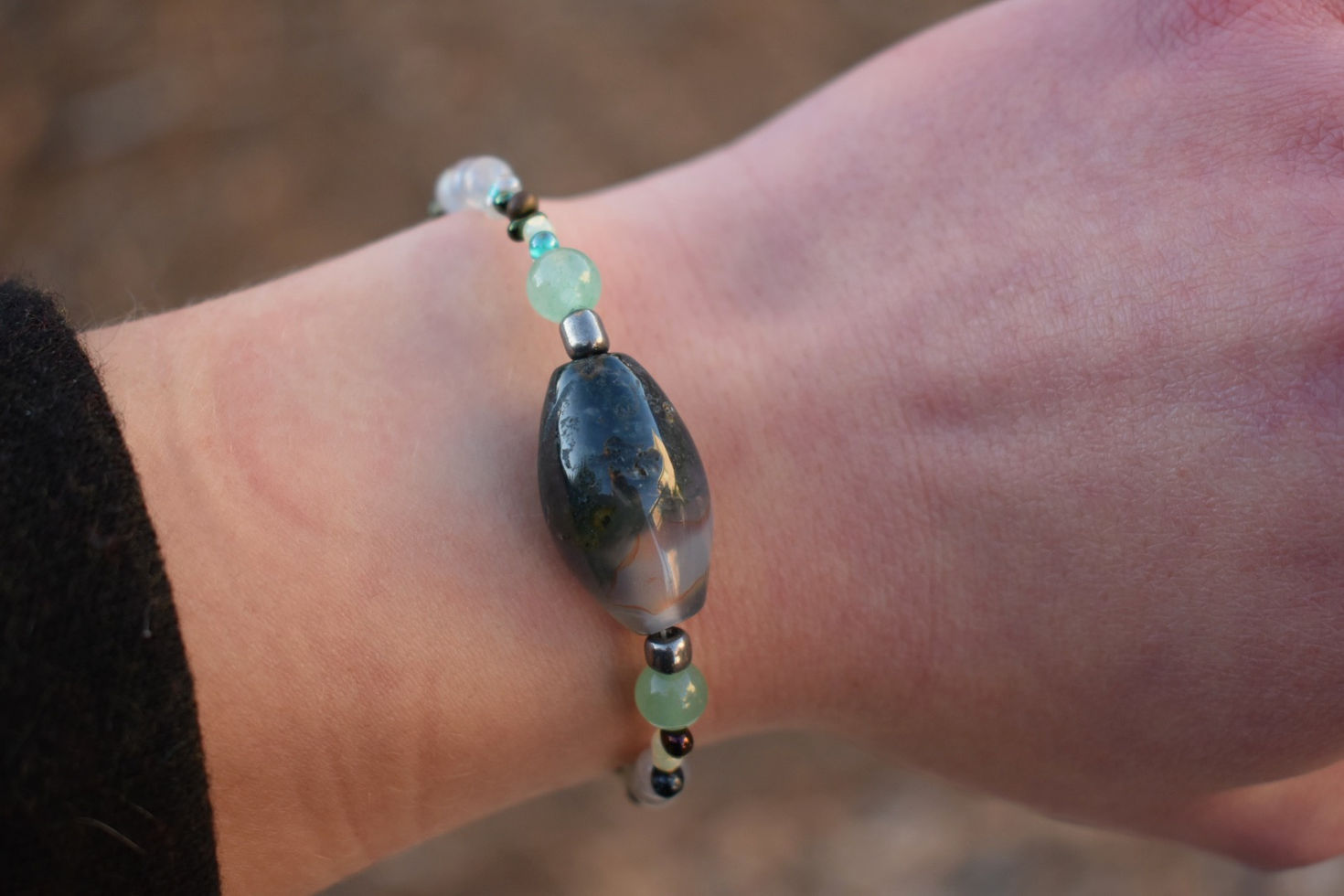 The Evergreen bracelet is one-of-a-kind and handmade. Trout is made with seed beads, moss agate, labradorite, aventurine, and clear quartz.